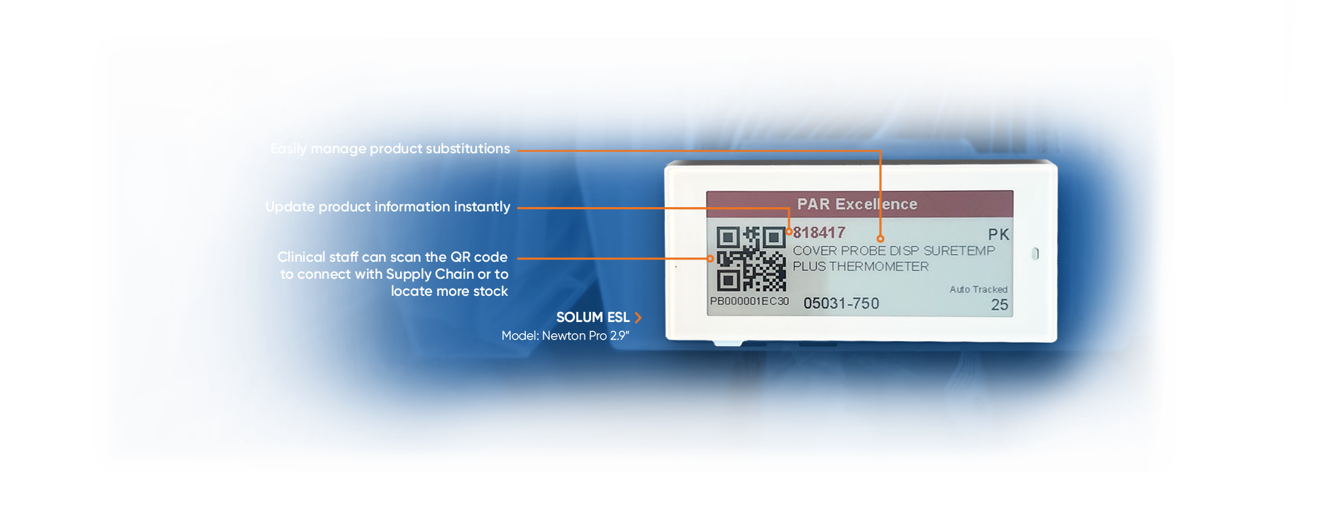 PAR’s Electronic Shelf Labels (ESLs) modernize healthcare inventory management by delivering real-time, accurate product information at the point of use—including instant updates for product substitutions. By eliminating manual label changes and paper-based processes, ESLs reduce errors, improve clinical communication, and free up valuable staff time.